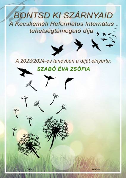 A BONTSD KI SZÁRNYAID a Kecskeméti Református Internátus tehetségtámogató díja
